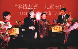 中华全国妇女联合会名誉主席陈慕华(左二)和全国人大常委会副委员长,全国妇联主席顾秀莲( 右二)在公益短信平台8858开通仪式上